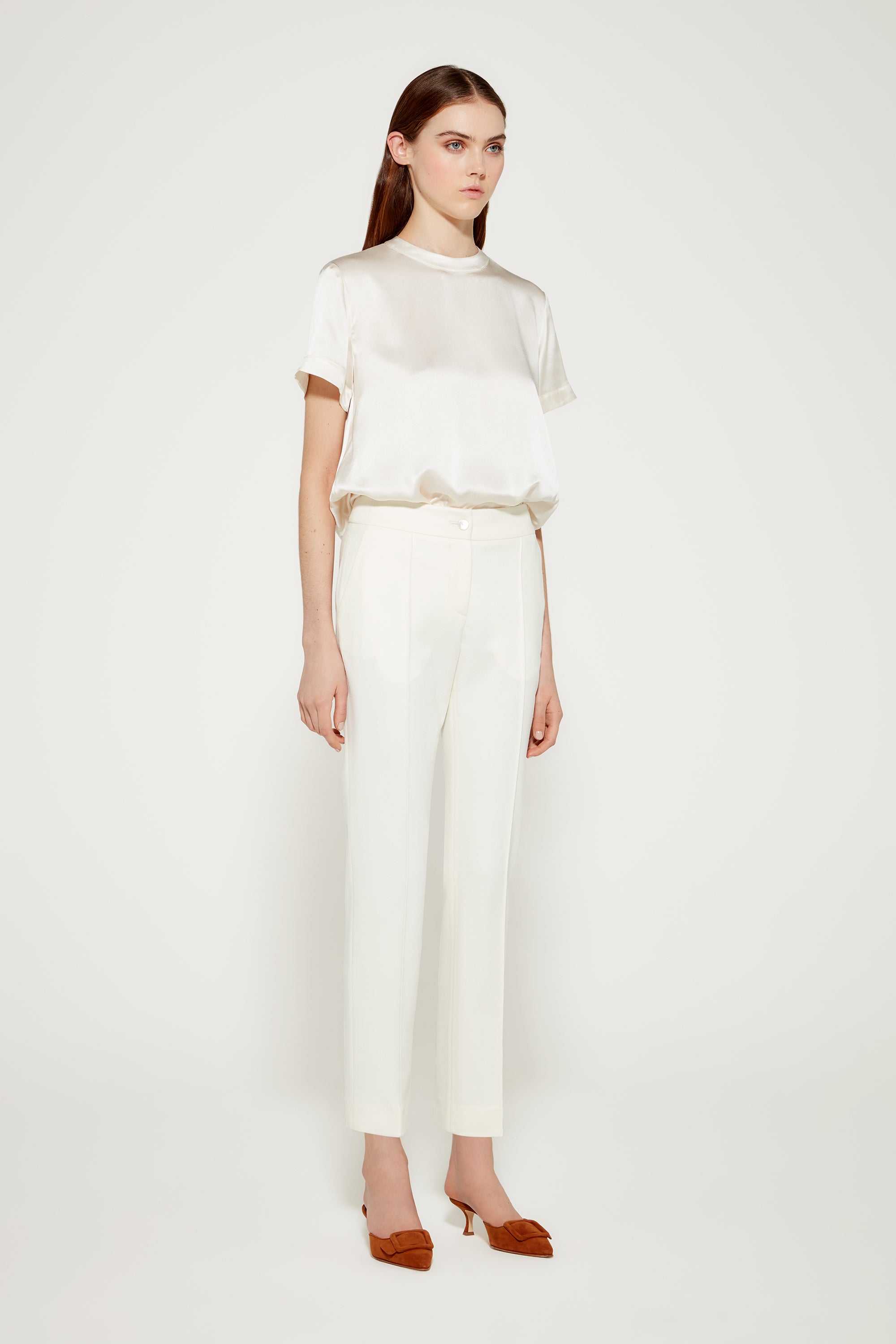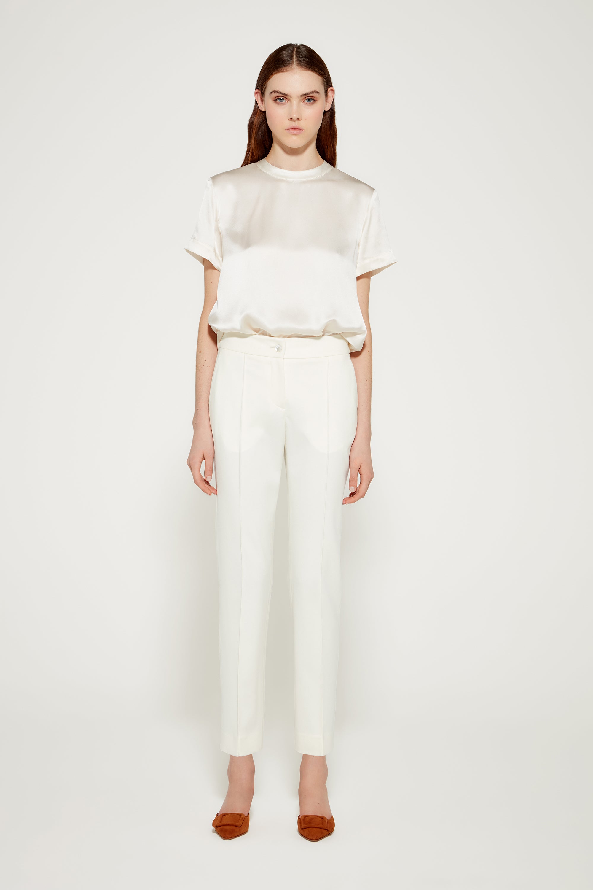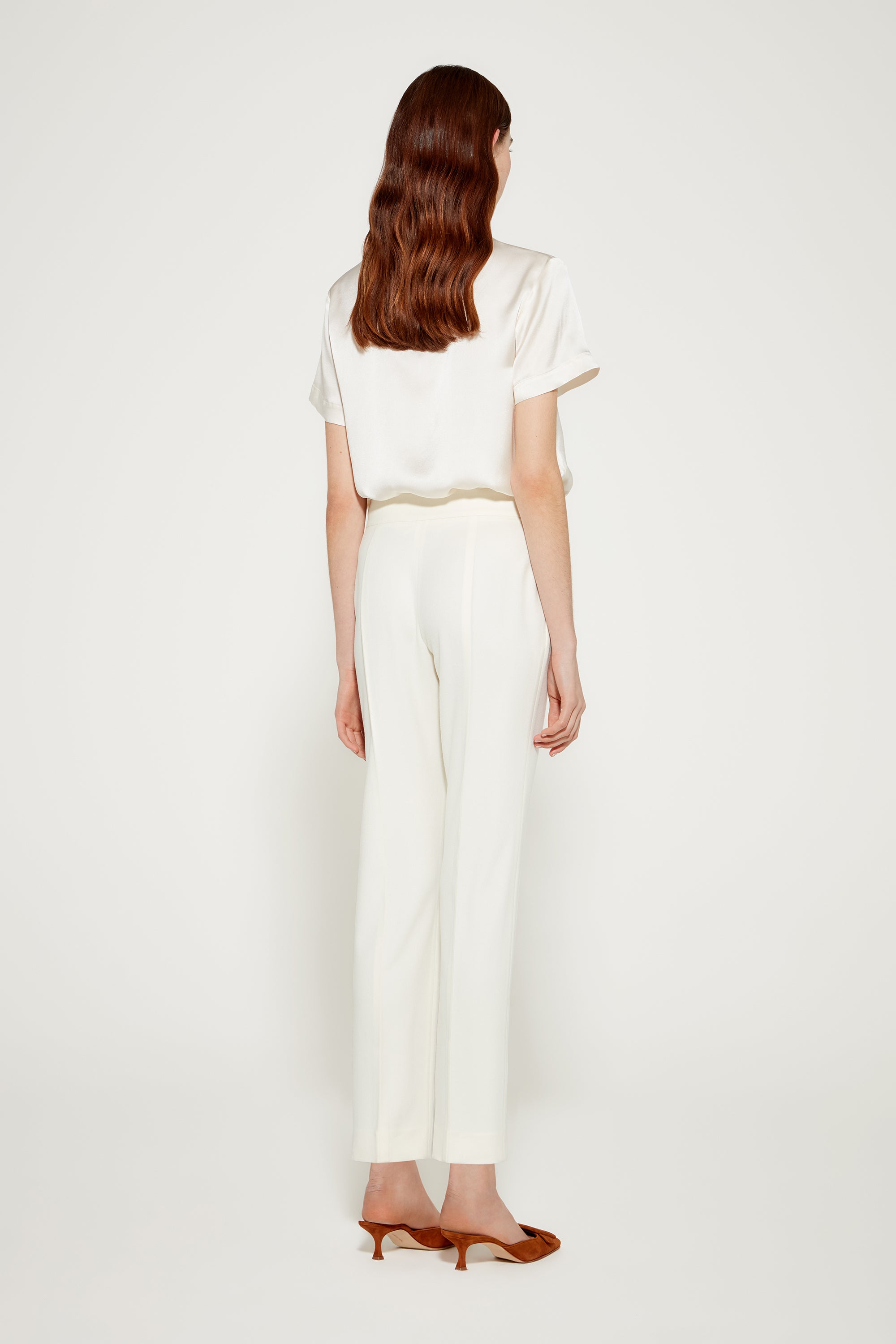The Nell pants, crafted with a mulesing-free wool fabric made in Italy by Loro Piana, is an elegant pair of pants that can either be styles in combination with the Nell blazer or more casually with one of our Suvretta jumpers. The tailored pants feature stitched princess-lines on the front and back and a bound buttonhole on center front. The pants are finished with side pockets and a certified Australian mother-of-pearl button.