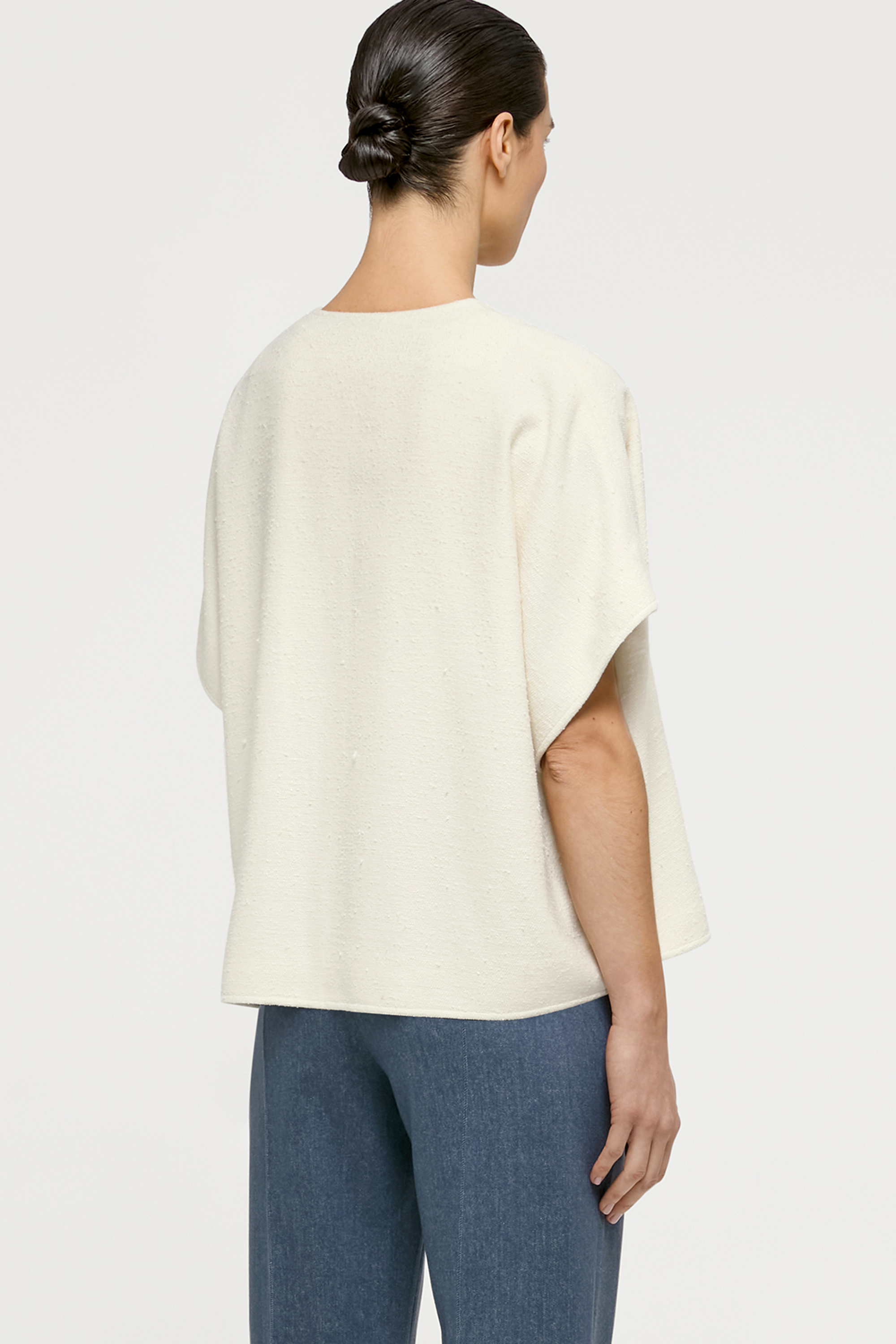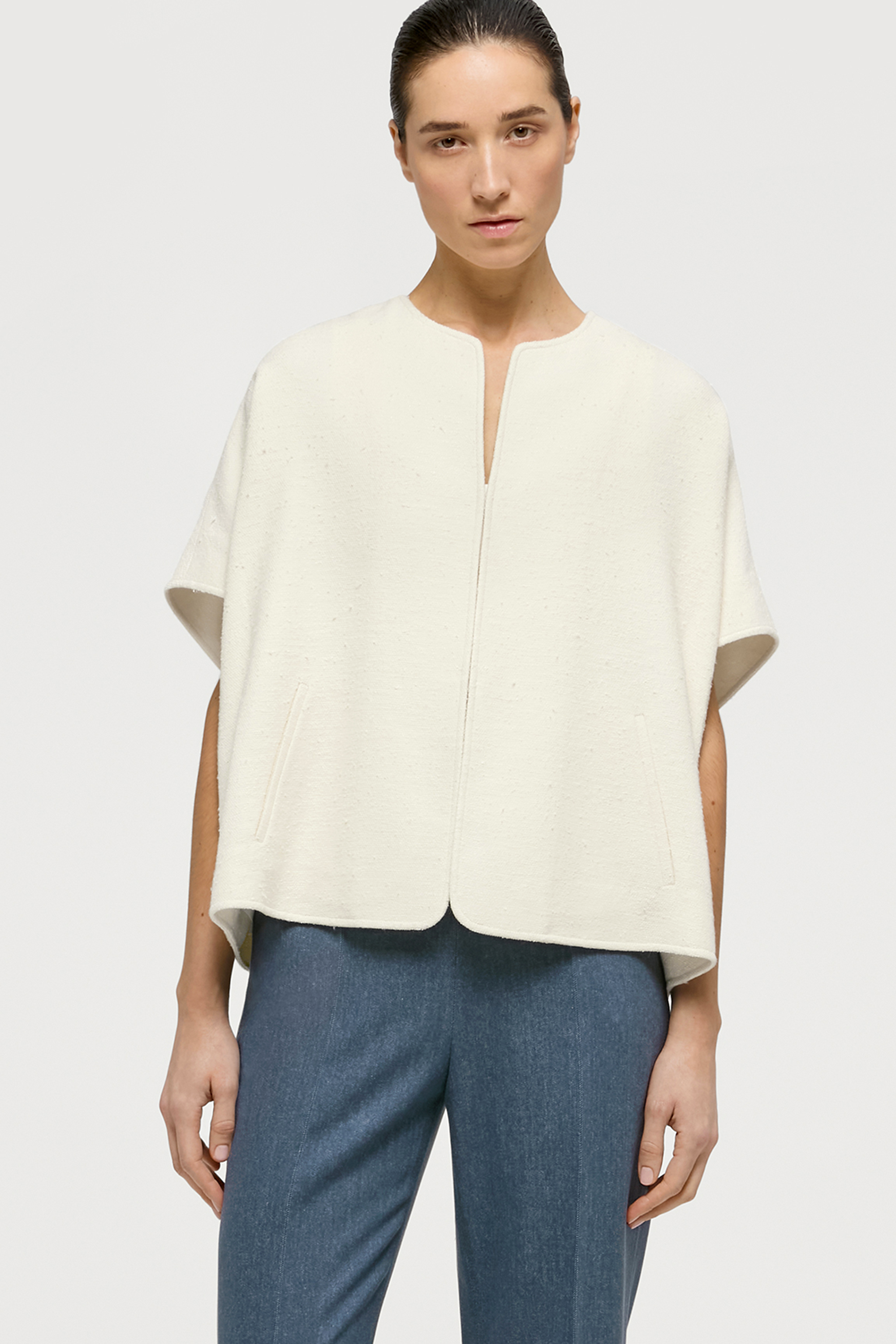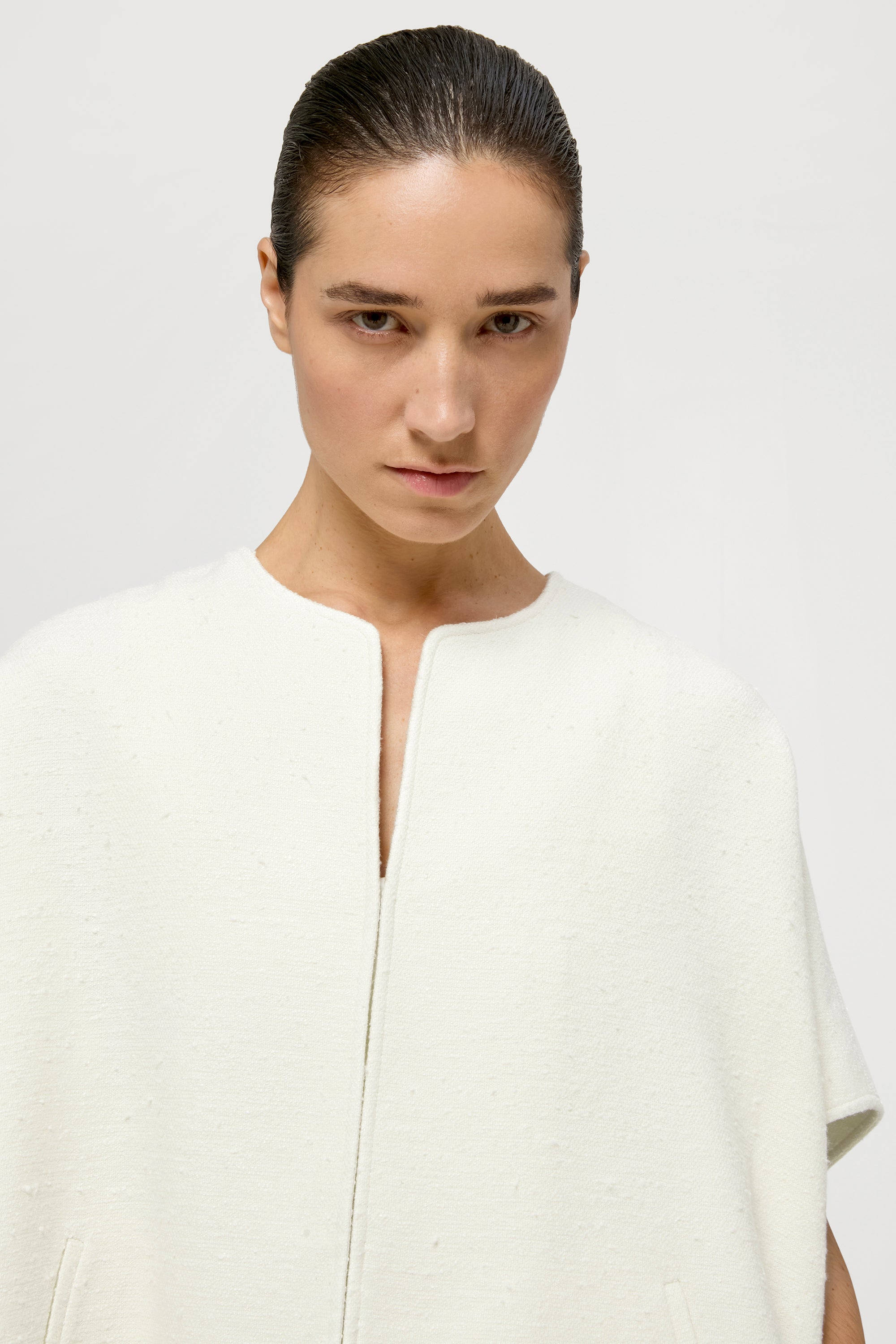 Tan meaning dawn in Japanese, the Tan Kimono Cropped Jacket Vest is a beautifully crafted piece that is meant to be thrown on during a crisp morning or a slightly more chilly summer evening. The jacket vest, which is hand-crafted from a beautiful and soft wool-linen-silk Loro Piana bouclé fabric, comes with roomy, kimono-cut sleeves, front pockets and features an elegant and invisible hooked front closure. The jacket vest is fully lined.