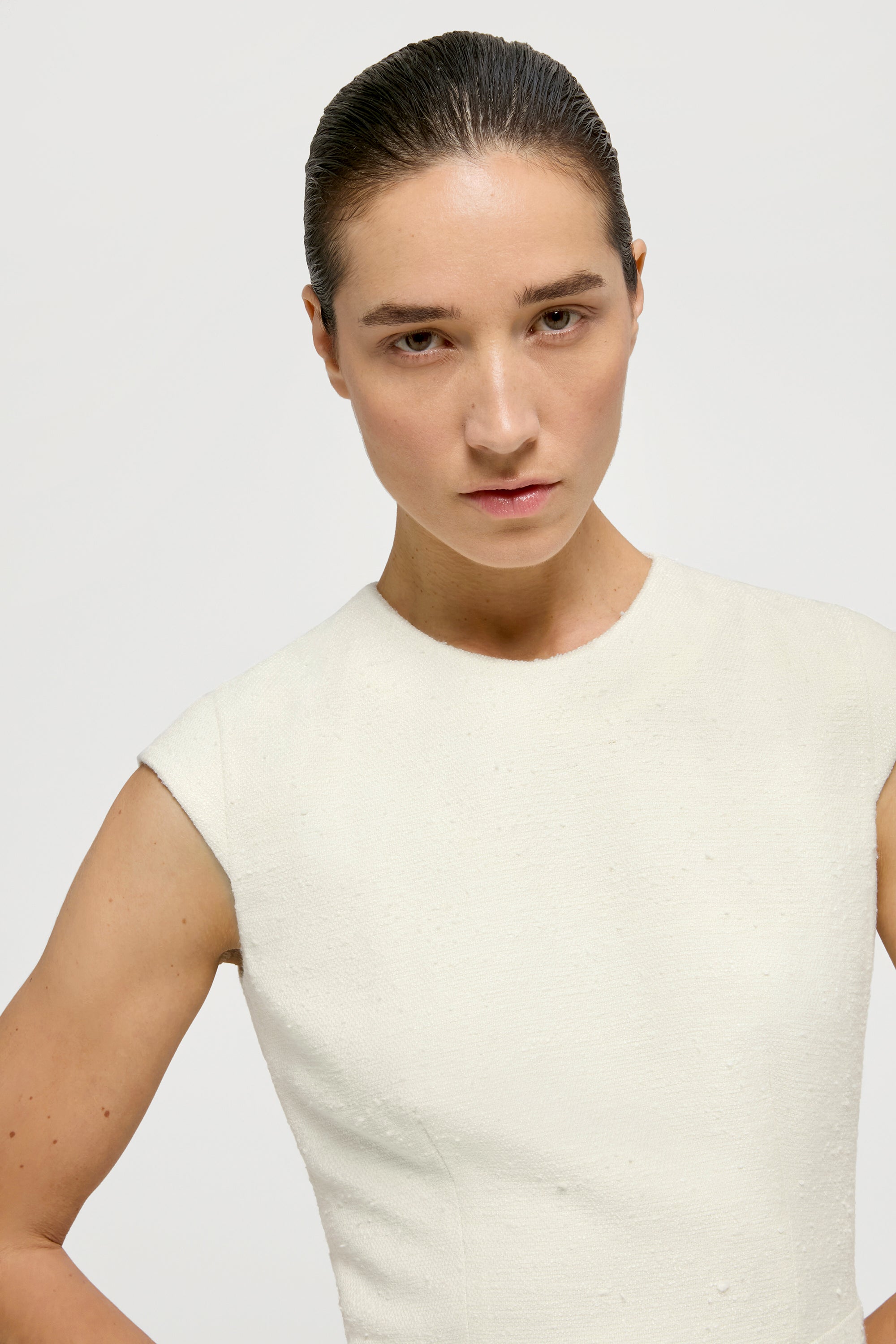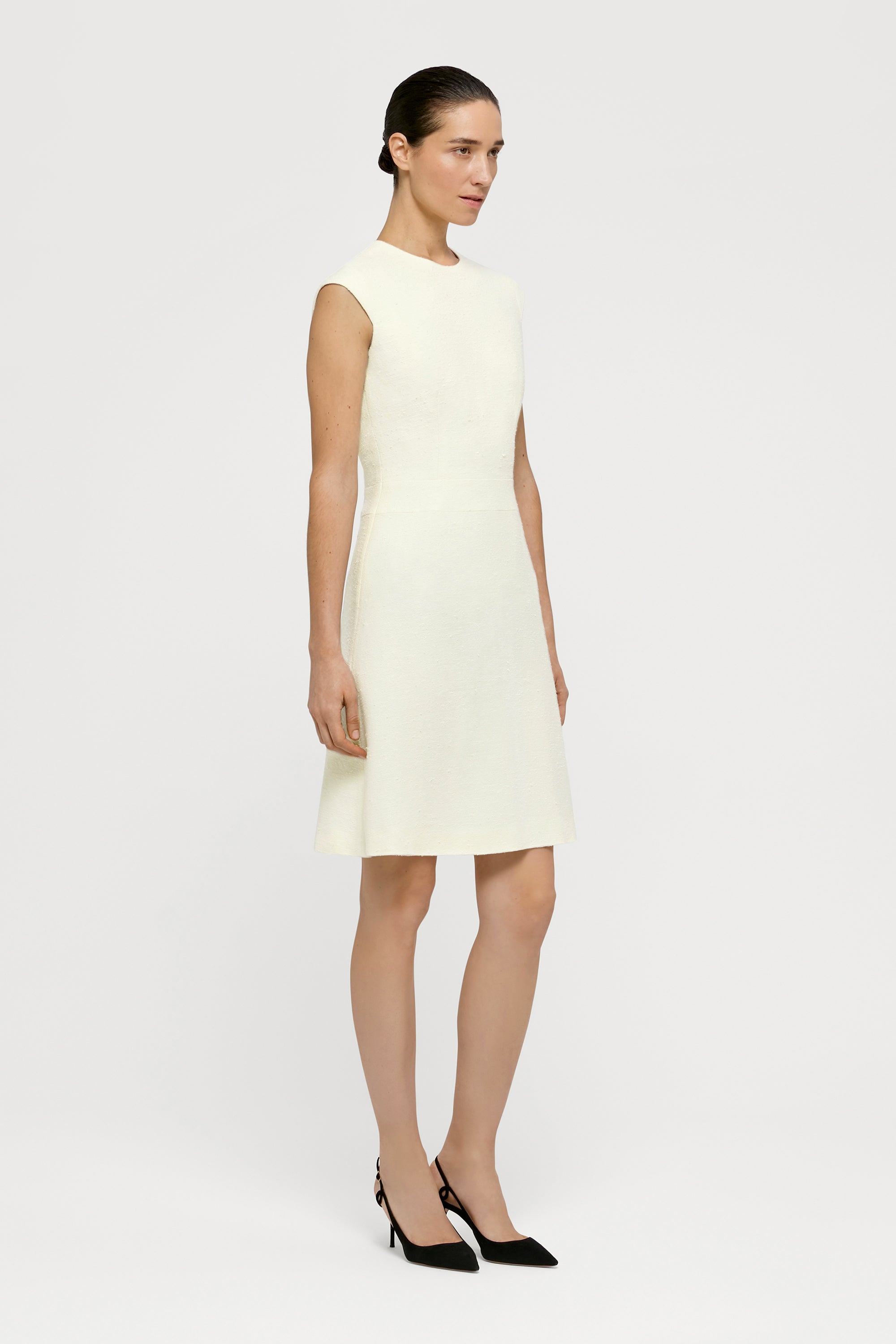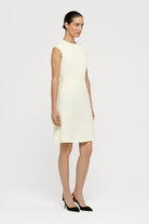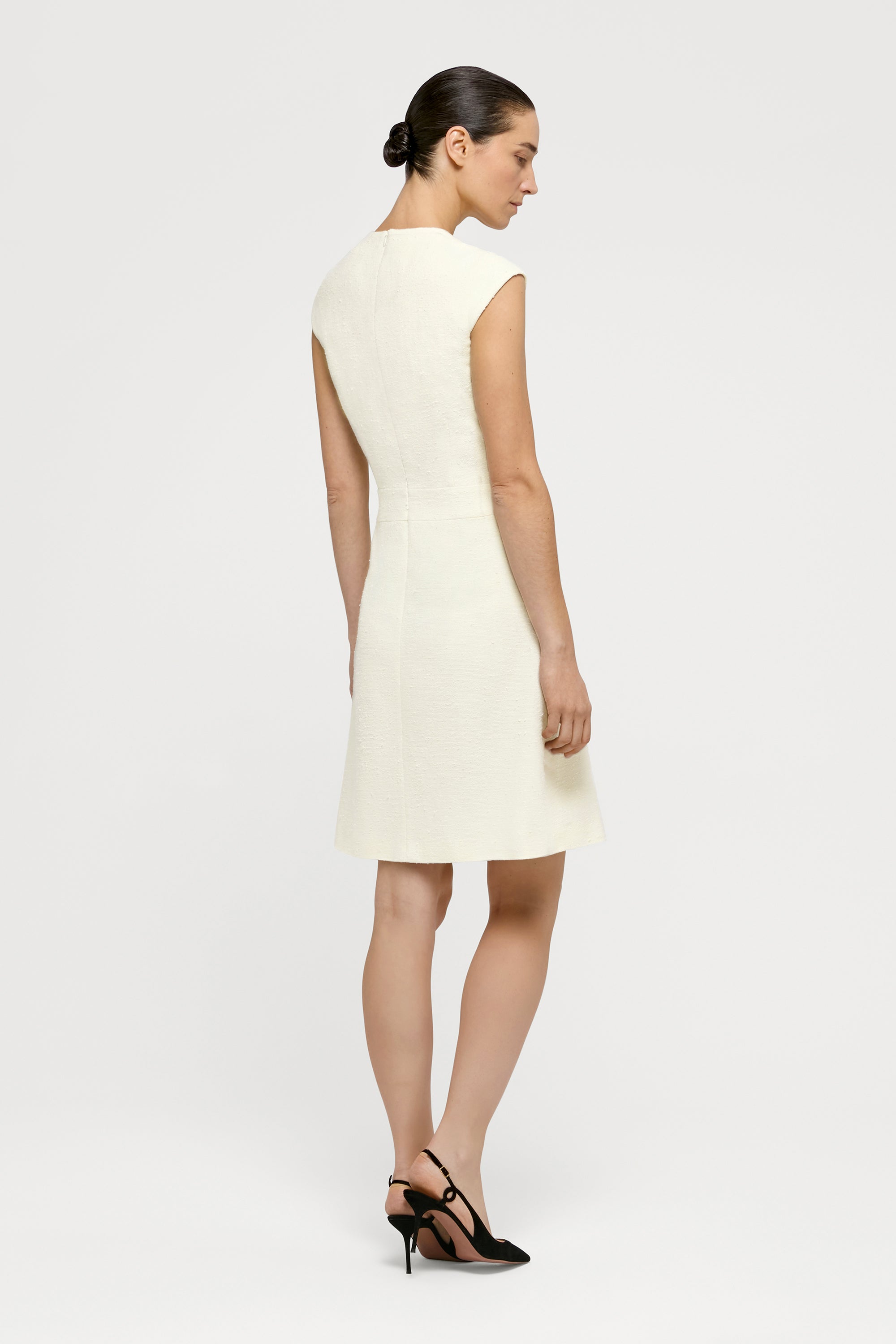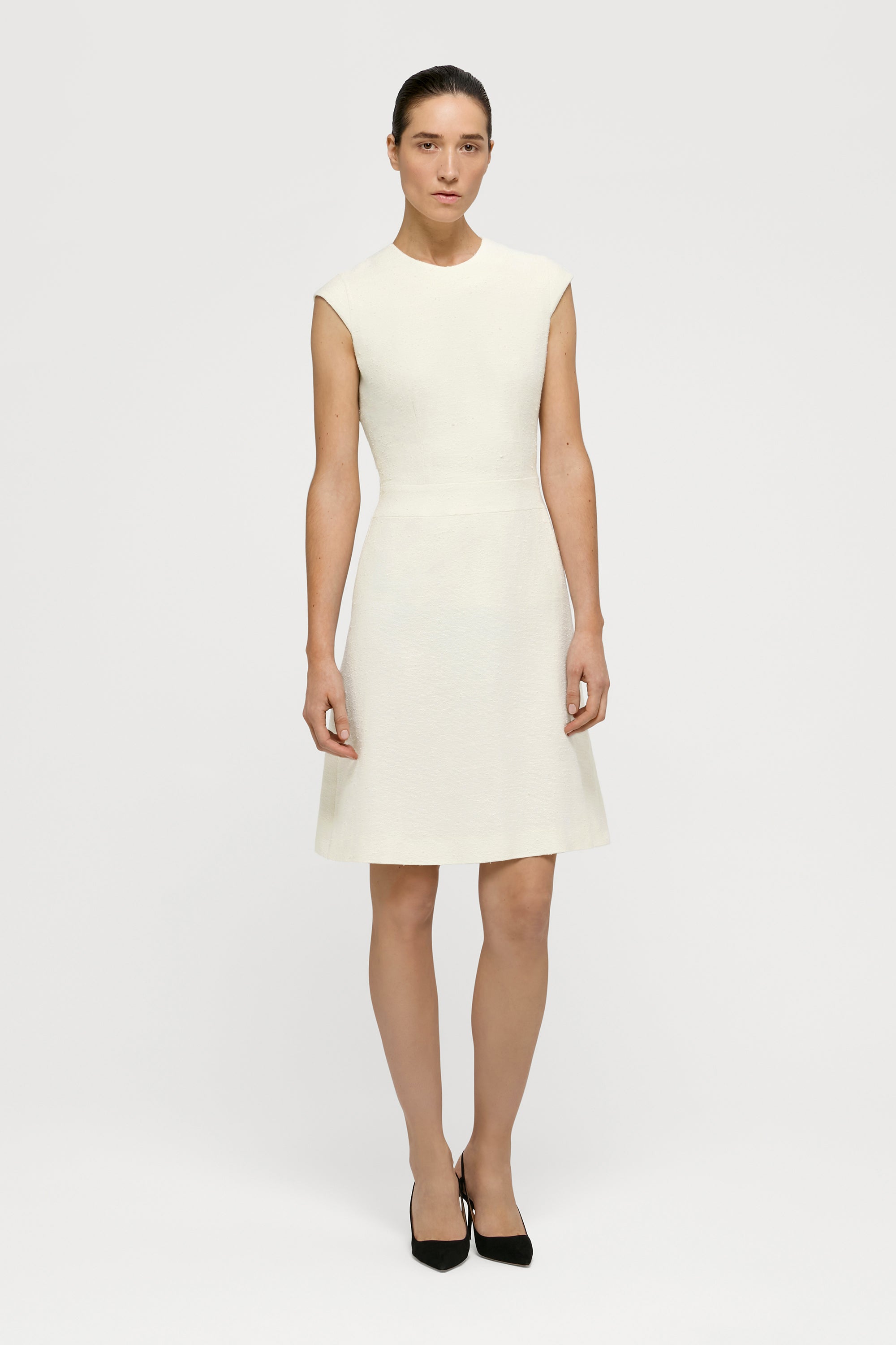 The Tan Dress, hand-crafted from a beautiful and soft wool-linen-silk Loro Piana bouclé fabric, comes with a slightly flared skirt and fitted bodice, complemented with tailored, slightly over-the-shoulder sleeves. The dress is finished with an invisible back zipper and is semi-lined.